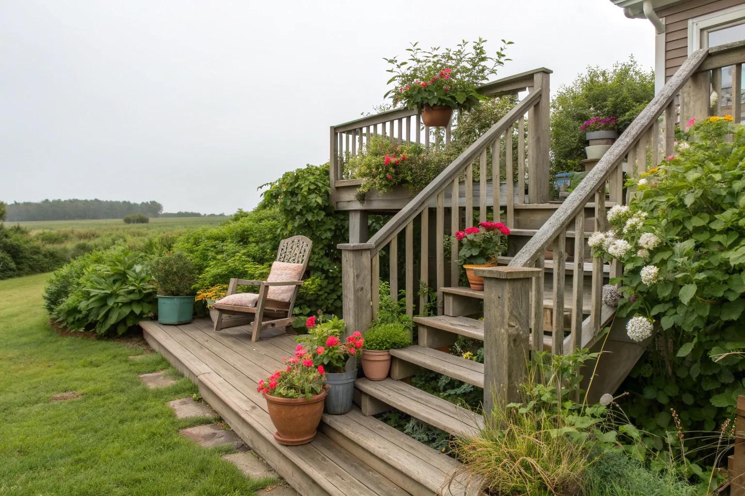 Incorporate planters and greenery into your stair design for a natural touch. I once designed a deck where the steps were flanked by lush planters, bringing nature closer.