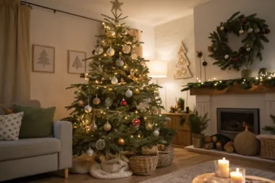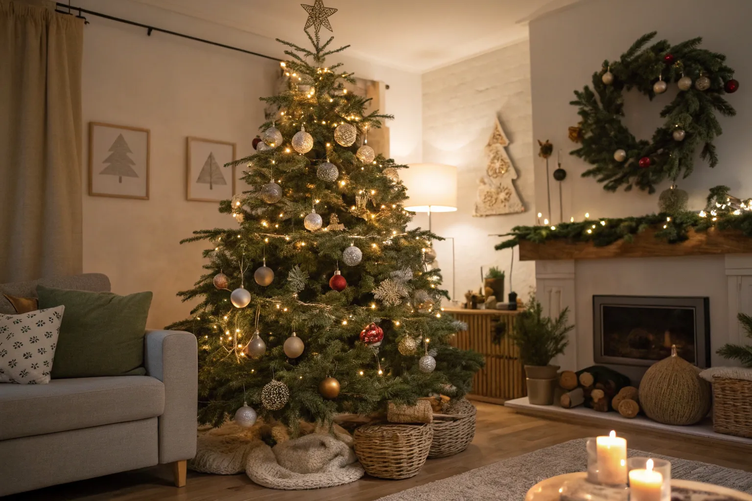 For a timeless look, adorn your pine tree with classic red and gold ornaments and twinkling lights. This setup never fails to make a room feel cozy and festive, and my clients always rave about the nostalgic charm it brings.