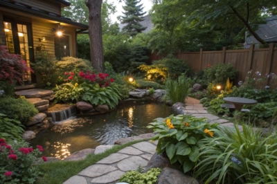 Perennials such as daylilies offer reliable color year after year around water features. They’re a staple in my designs for their long-lasting blooms and easy care.