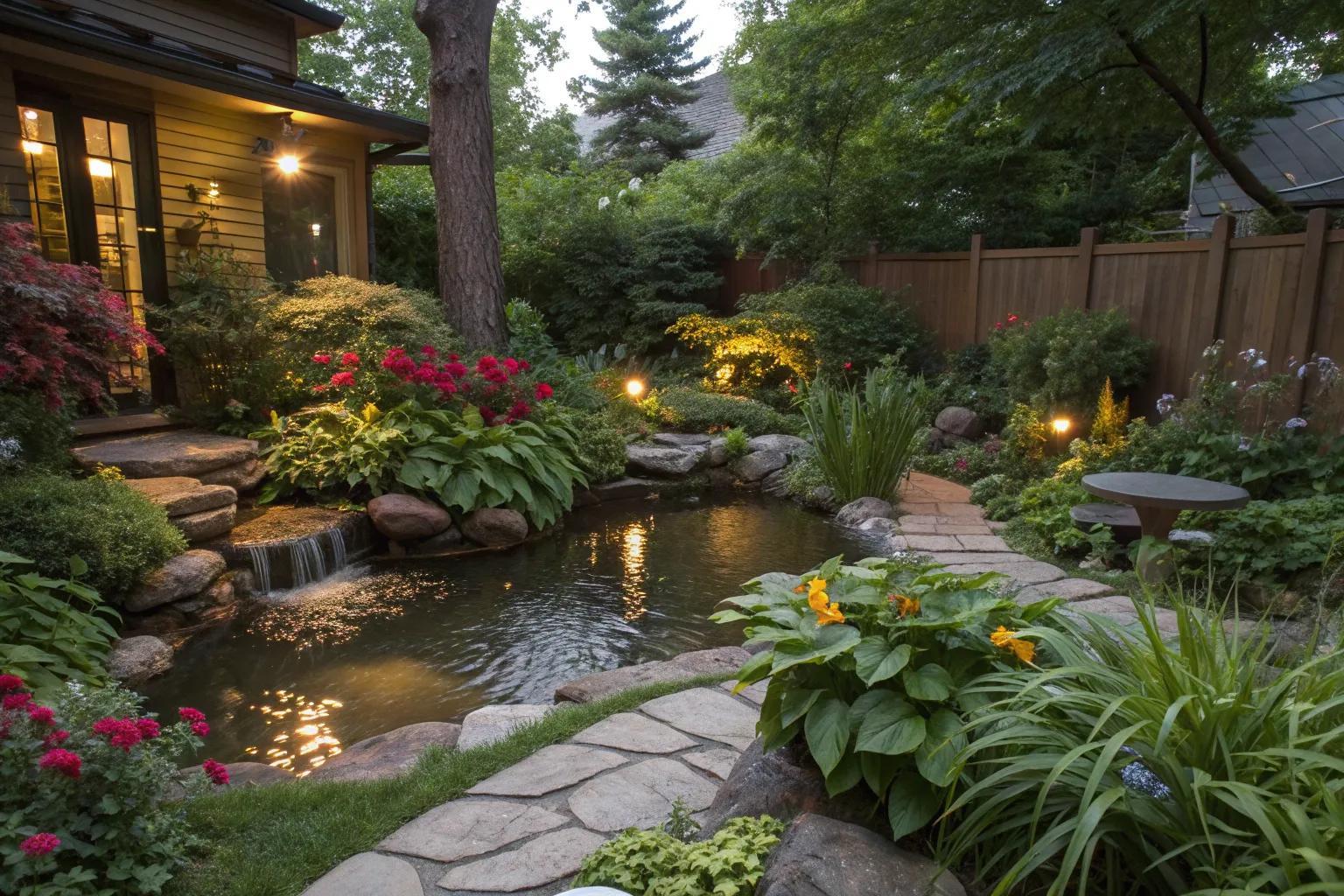 Introduce aquatic plants like water lilies to make your pond feel more natural. In my garden, they not only beautify the water surface but also attract delightful wildlife.