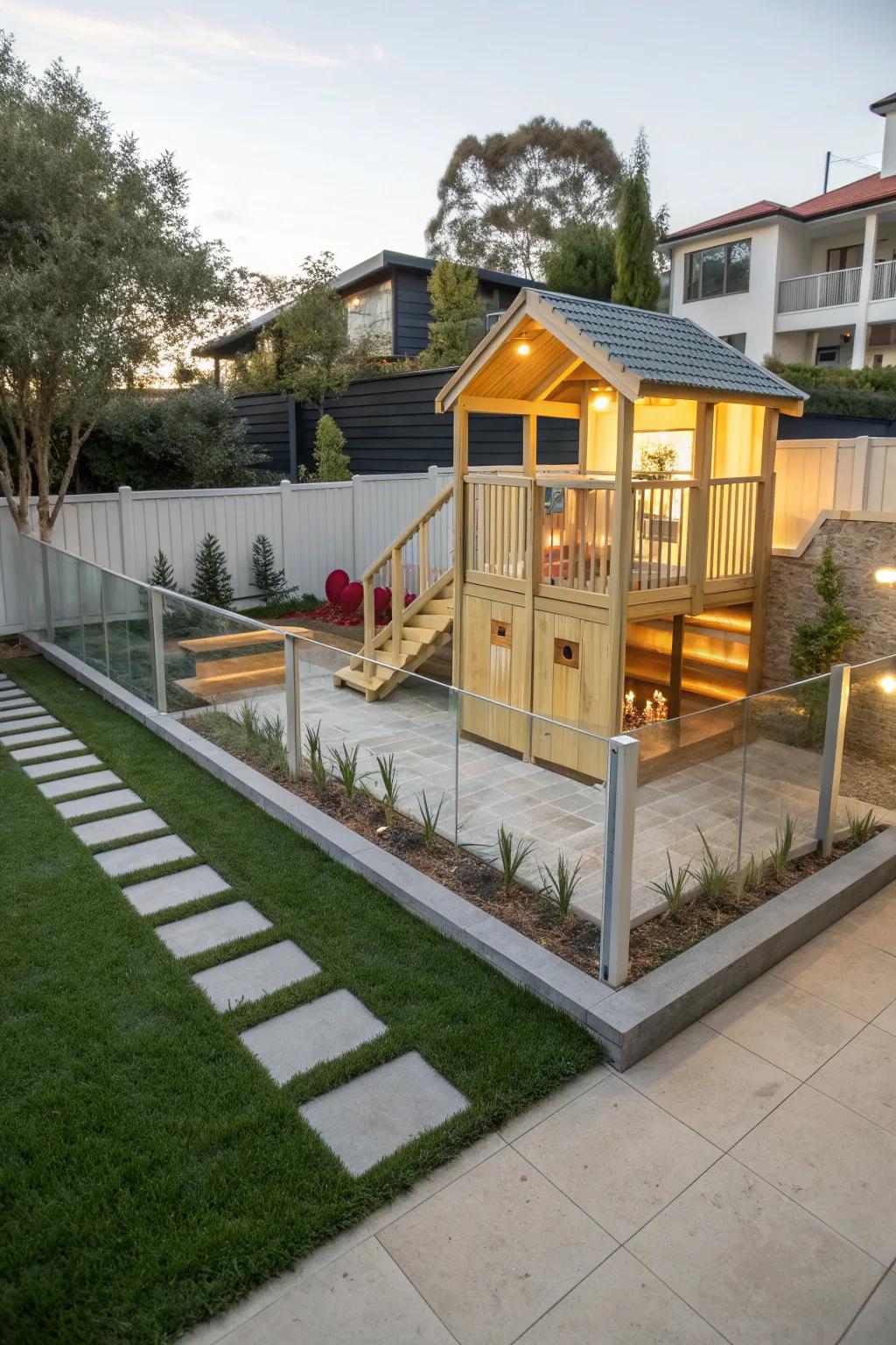 Achieve a stunning effect by adding stained glass panels to your playhouse railings. It’s a unique touch that I’ve seen spark joy and wonder.