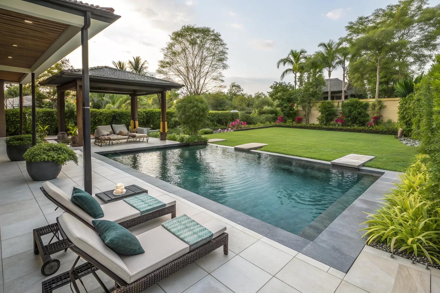 For a sleek and stylish vibe, opt for a minimalist rectangular pool with clean lines and a dark interior finish. I’ve seen this design transform spaces into modern sanctuaries, reflecting natural beauty with a touch of elegance.