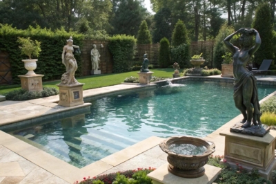Bring your imagination to life with fantasy figure statues like nymphs or fairies. These figures can add a mystical charm, especially near a hidden garden path leading to the pool.
