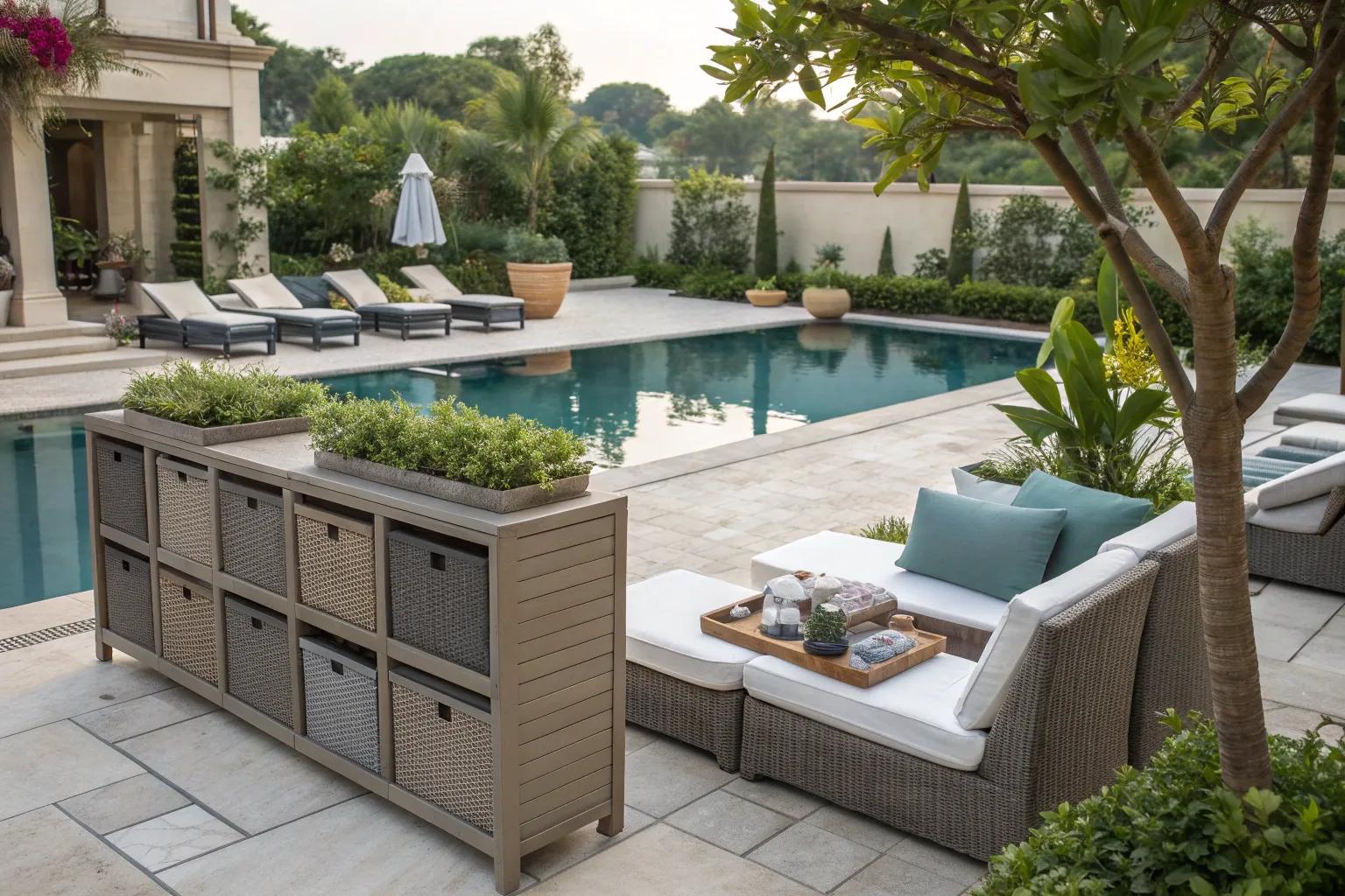 Consider a dedicated cabinet for pool equipment like pumps and filters. It keeps everything organized and can be stylishly integrated into your outdoor decor.