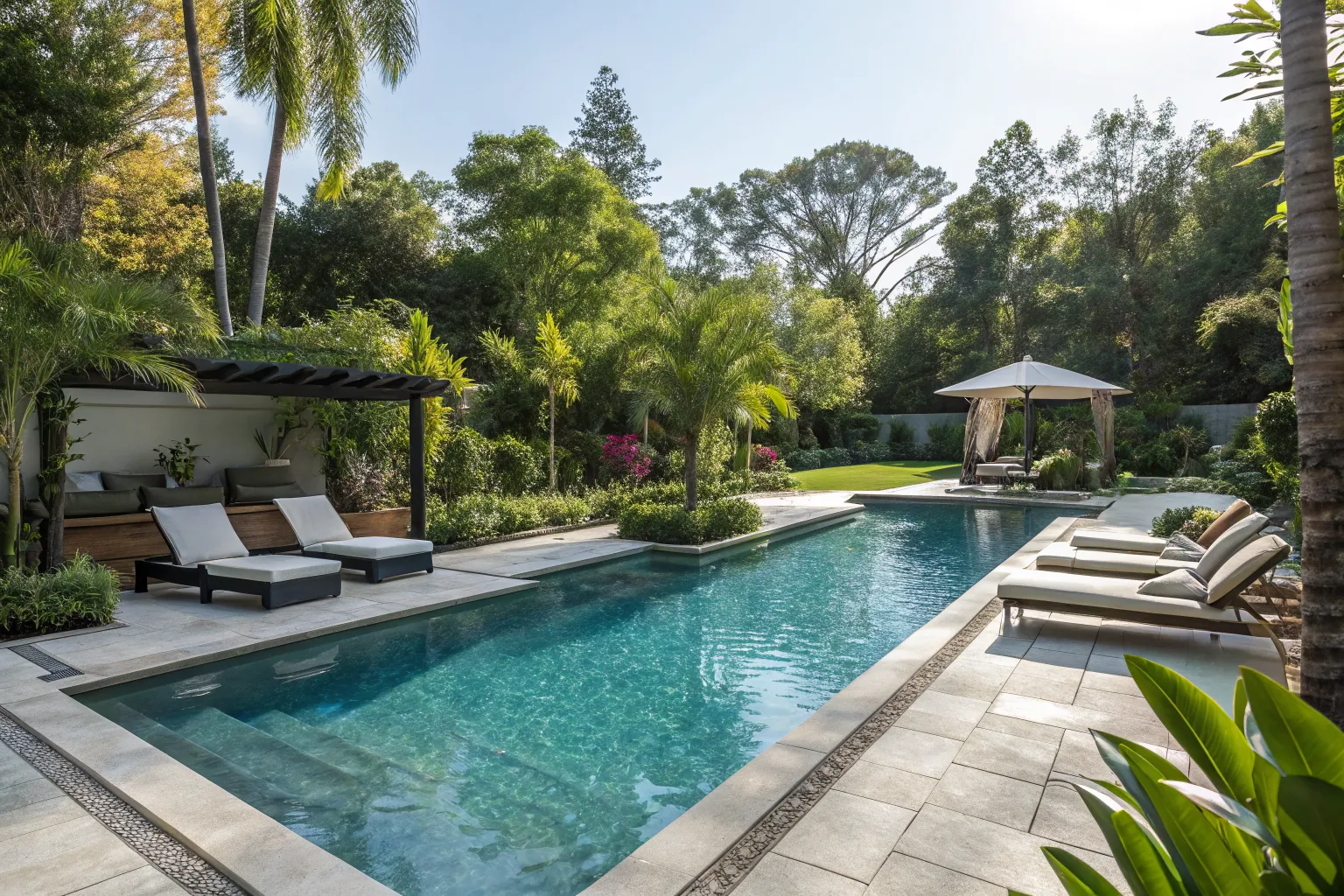 Install a convertible shade structure for flexibility in sun and shade. I’ve seen how this feature allows clients to customize their lounging experience throughout the day.