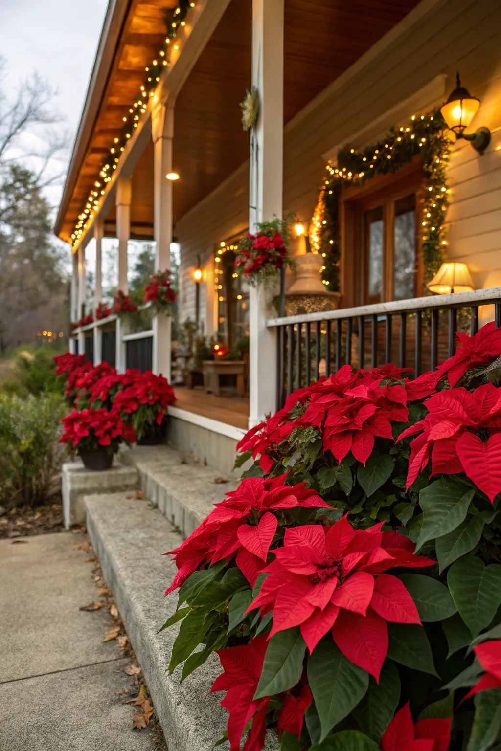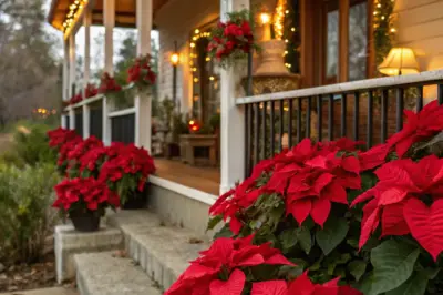 - Christmas Porch Garland with Lights: Enhance your holiday ambiance with a lit garland, perfectly complementing your poinsettias.