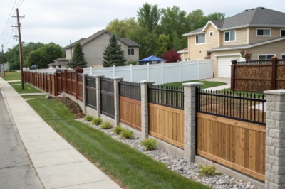 Combine the warmth of wood with the industrial feel of metal for a fence that stands out. This mix is ideal for those who want a striking, modern aesthetic.
