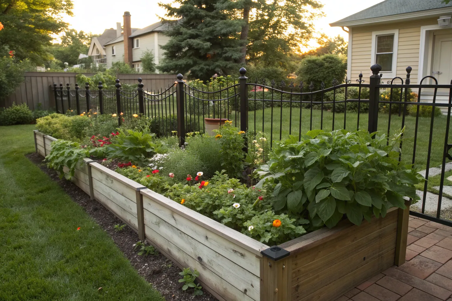 Nothing beats the timeless charm of a classic wooden fence around your raised garden bed. I often recommend untreated, rot-resistant lumber to my clients for a natural look that blends seamlessly with the yard.
