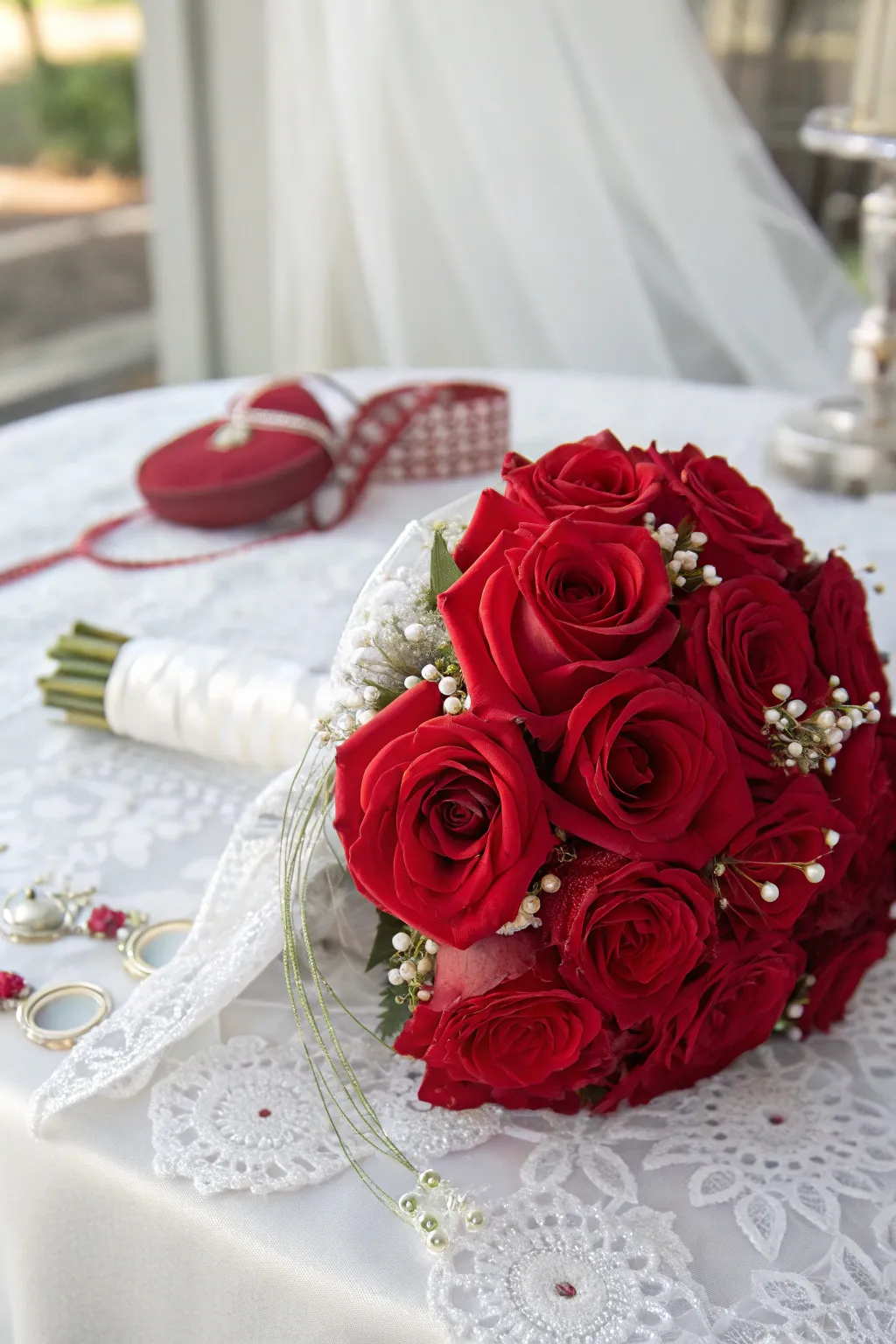 - Elegant Red Bridal Ribbon: Add a touch of elegance to your bouquet with this luxurious satin red ribbon.