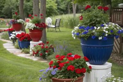 For a modern touch, use sleek concrete planters. Pair them with red salvias, white daisies, and blue pansies for a minimalist yet vibrant look.