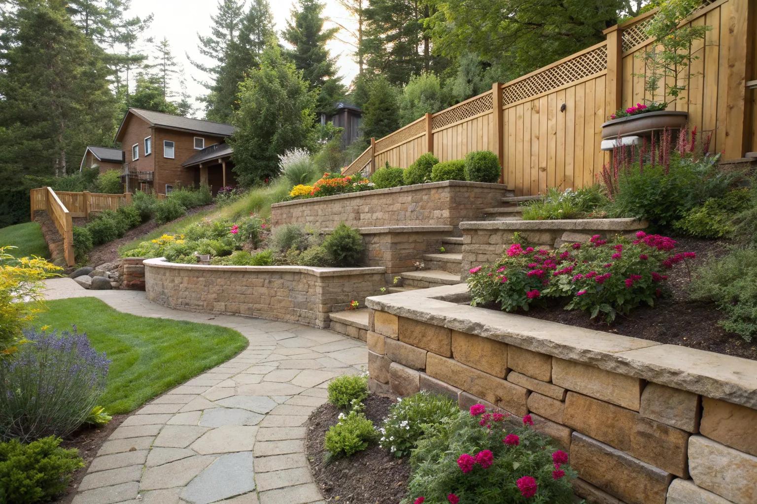 Create a stunning layered garden with retaining walls that define distinct planting areas. This approach not only adds depth but also allows for diverse plant arrangements.