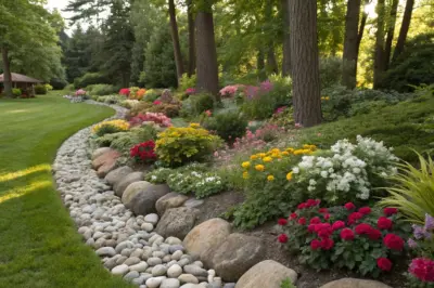 Create a dry creek bed with river rocks for a landscape that’s both functional and beautiful. It’s one of my go-to solutions for areas with water drainage issues.