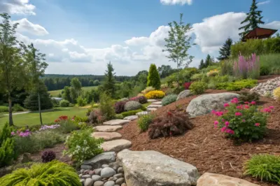 Combine a variety of plants with rocks and mulch for a lush, textured look. Mixing shrubs, flowers, and small trees has been a game-changer in many of my client projects.