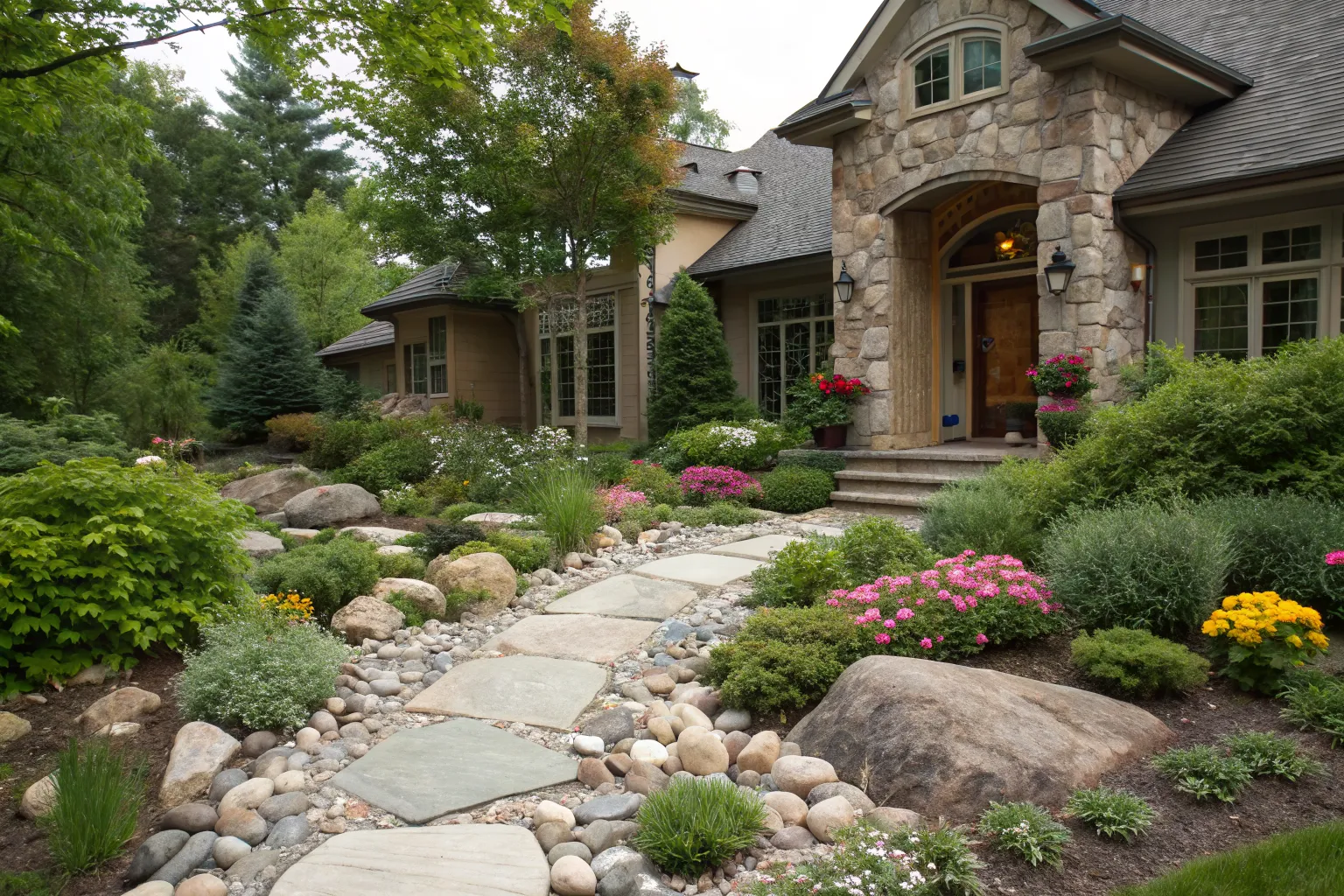 A winding rock pathway leading to your front door adds a touch of charm and sophistication. I love how it naturally guides guests while integrating beautifully with the surrounding plants.