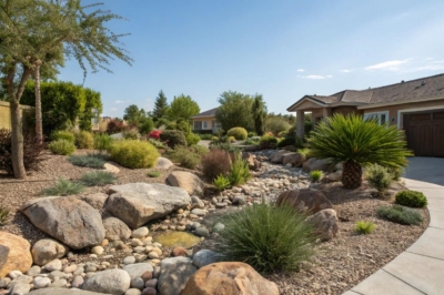 Replace traditional mulch with rock mulch for a clean and modern look that also helps retain soil moisture. I’ve found it especially useful in areas with harsh sunlight.