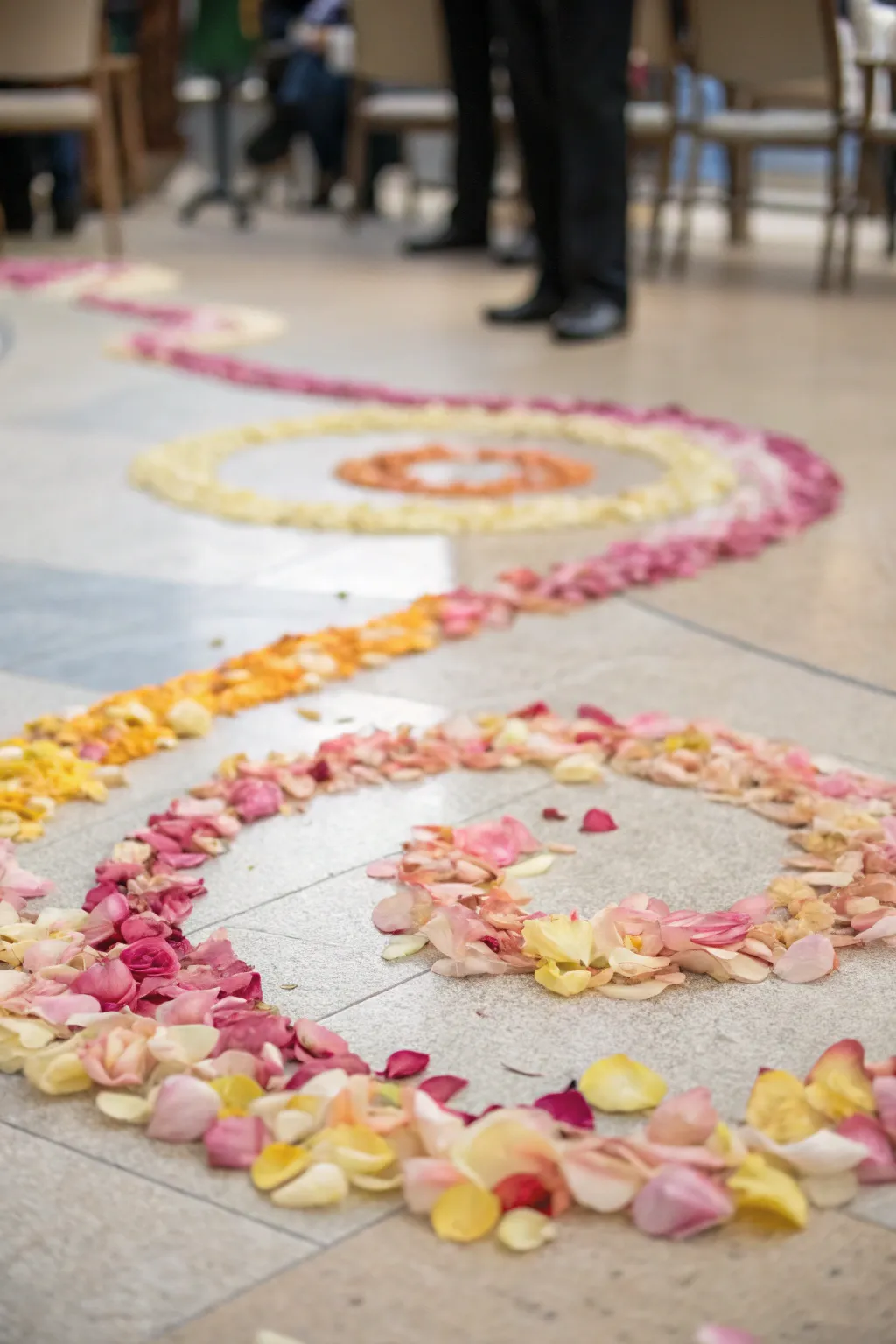 Create a stunning floor display with rose petals, perfect for a party or special event. It’s an unexpected and delightful way to use these beautiful blooms.