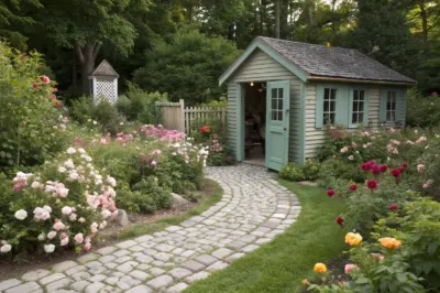 Frame your she shed with a stone or brick path and consider adding a quaint picket fence. These elements guide guests and add a touch of whimsy.