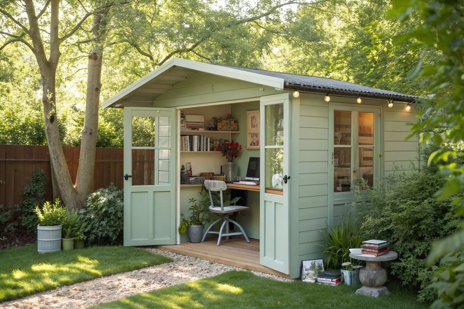 String lights or a stylish lamp can add a cozy, ambient feel to your shed office. My clients often find that the right lighting can transform the mood of a space instantly.
