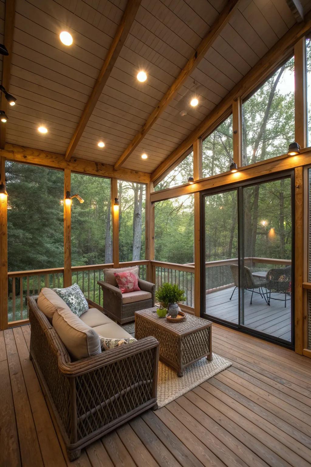 Consider using sustainable materials and energy-efficient lighting. Not only is it good for the planet, but it also adds a modern, responsible touch to your porch design.