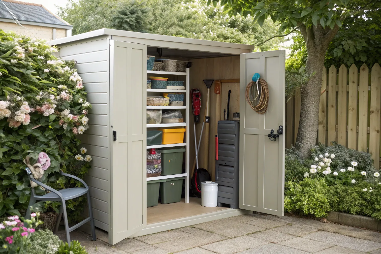 Don’t let shed doors go to waste—add some hooks or baskets to store lighter items. It’s a clever way to maximize every inch of space.