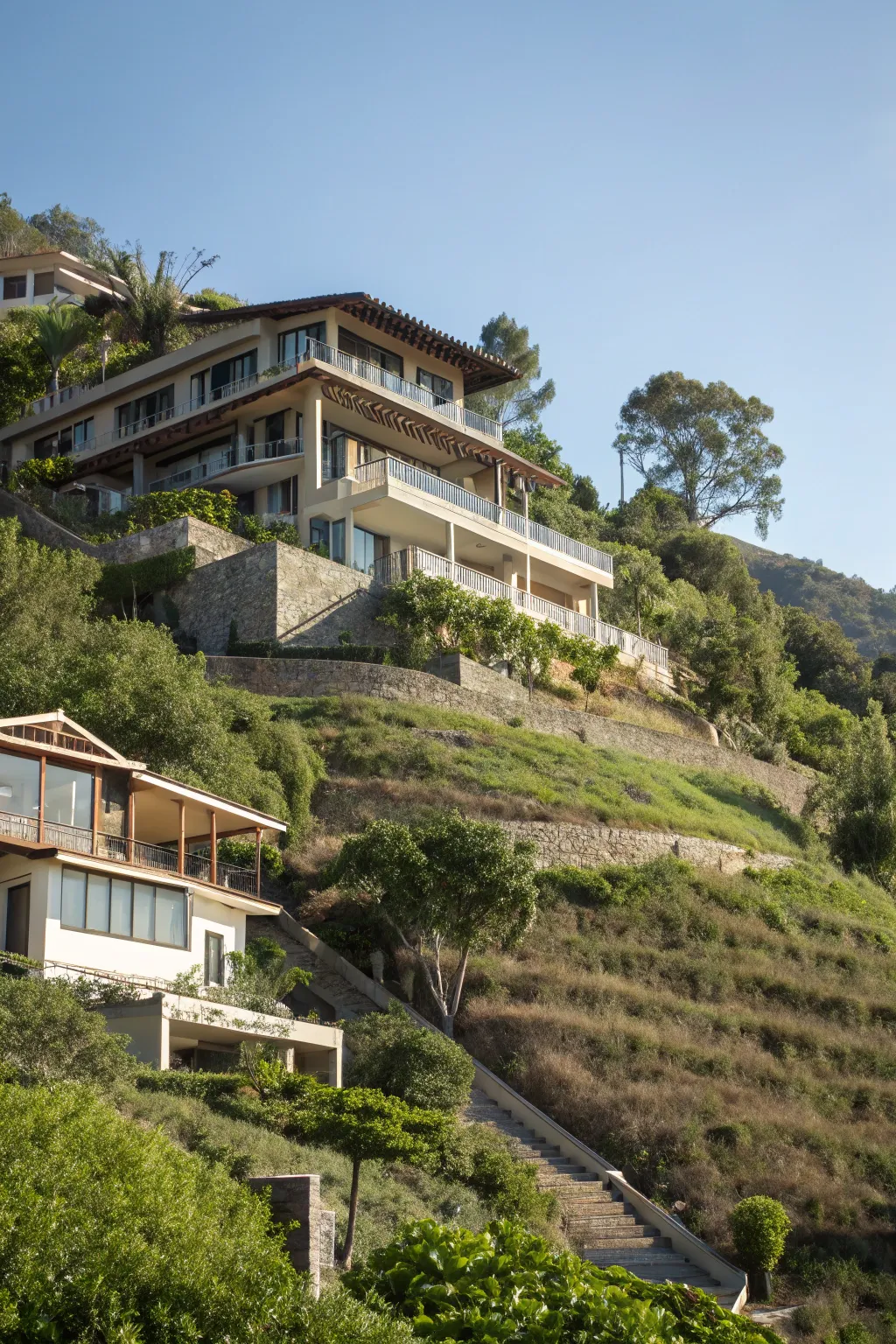 Make the most of vertical space with multi-story layouts that fit naturally into the hillside. This approach allows for efficient use of space while maintaining a compact footprint.