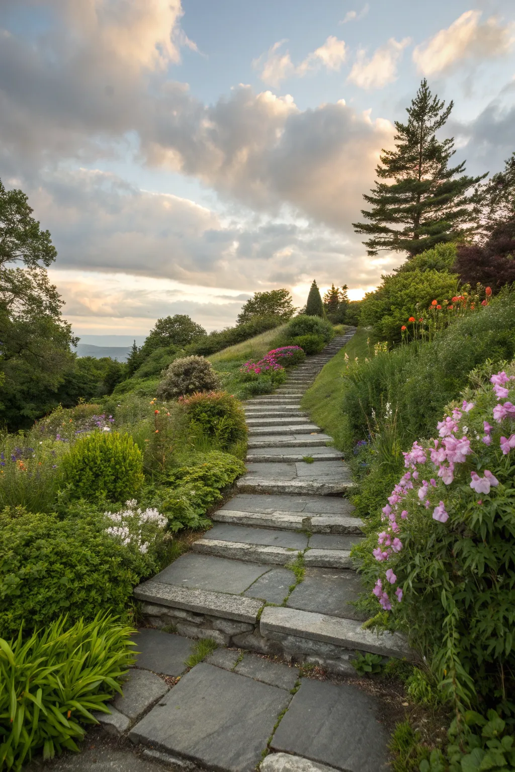 Incorporate slate steps to navigate through changes in elevation. This adds dimension and interest to your garden while making transitions smooth and stylish.