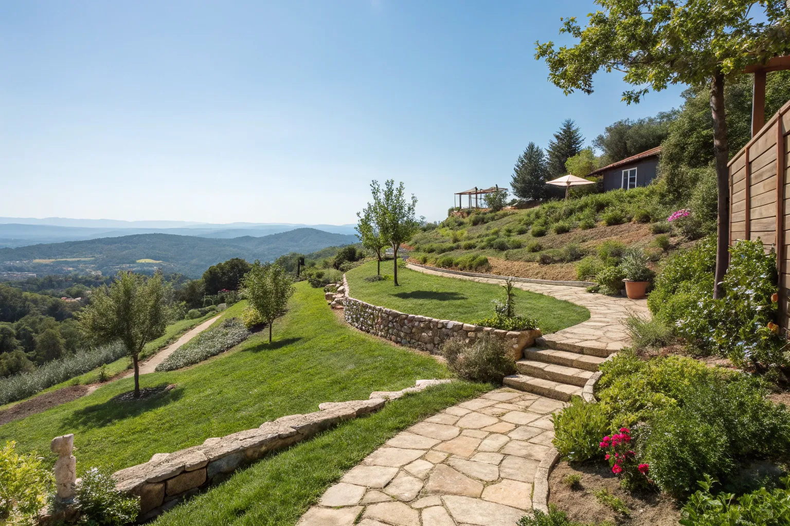 Adding a pergola on a slight slope creates a charming focal point and provides shade. I’ve designed pergolas that seamlessly integrate into the landscape, offering a cool retreat.
