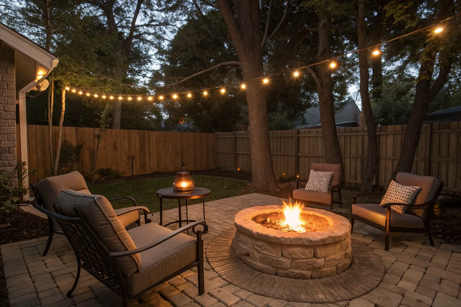 Enhance the ambiance with string lights draped around your fire pit area. It’s an easy way to add charm and warmth, as many of my clients have discovered.