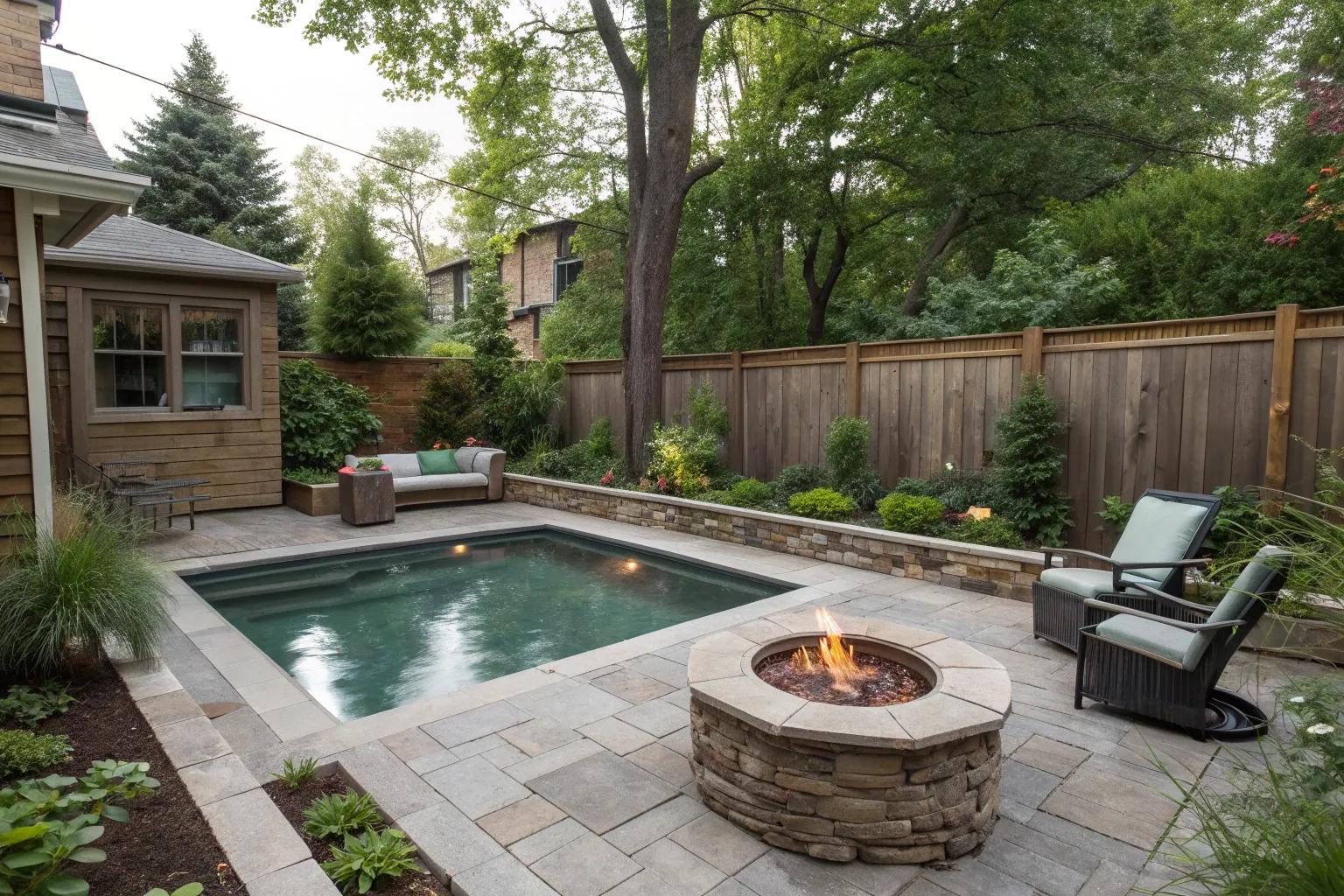 Consider an integrated firepit that seamlessly connects with your pool design. This approach maximizes space and creates a unified look, something I always strive for in smaller yards.