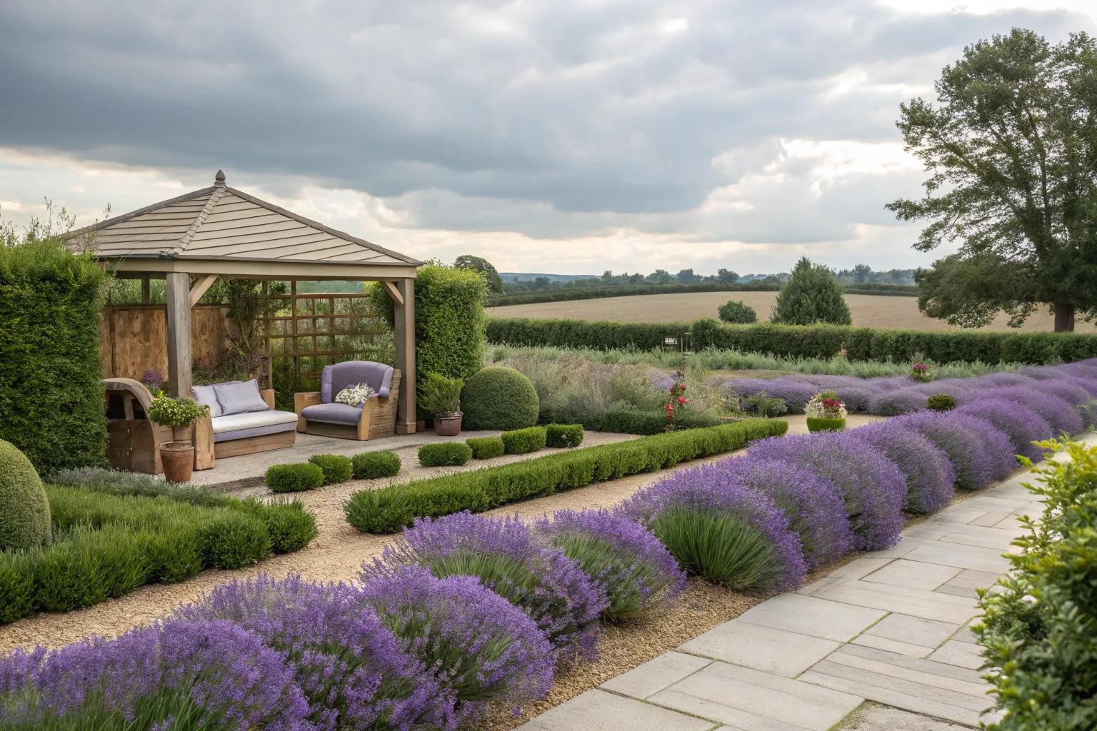 Incorporate lavender into a Zen garden for a peaceful, meditative space. This design is perfect for those seeking tranquility and simplicity in their garden.
