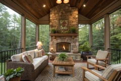 Enhance your porch’s aesthetic with exposed ceiling beams that complement the fireplace. They add a rustic touch that many of my clients adore.