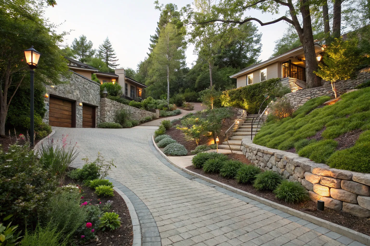 Curved driveways can turn a steep incline into a scenic route, reducing the perceived slope and adding visual interest. I’ve found this design particularly effective in creating a relaxed journey up or down the driveway.