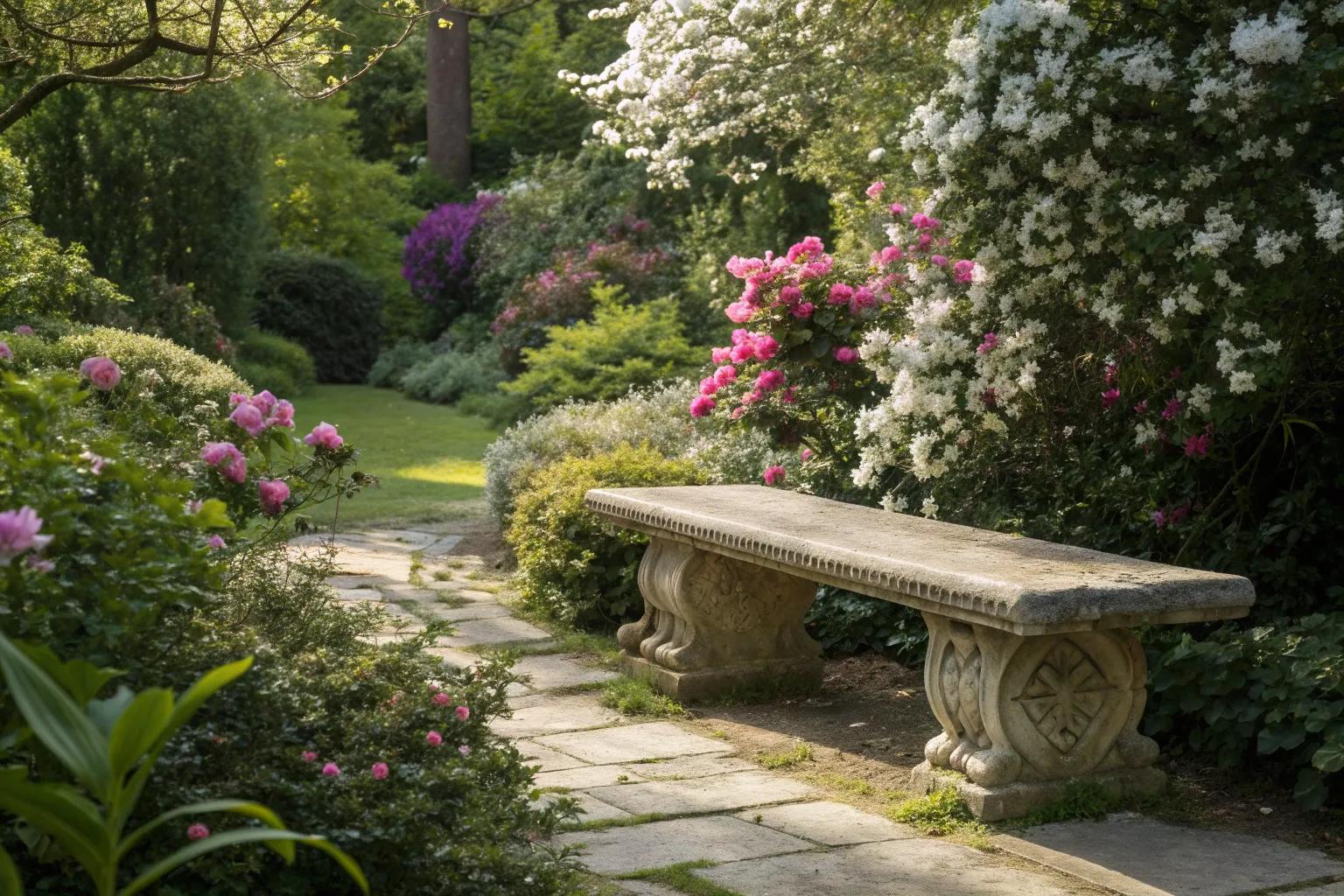 Integrate your stone bench into the garden for a seamless look. I’ve seen how these benches can disappear into the landscape, offering a surprise seat among the flowers.