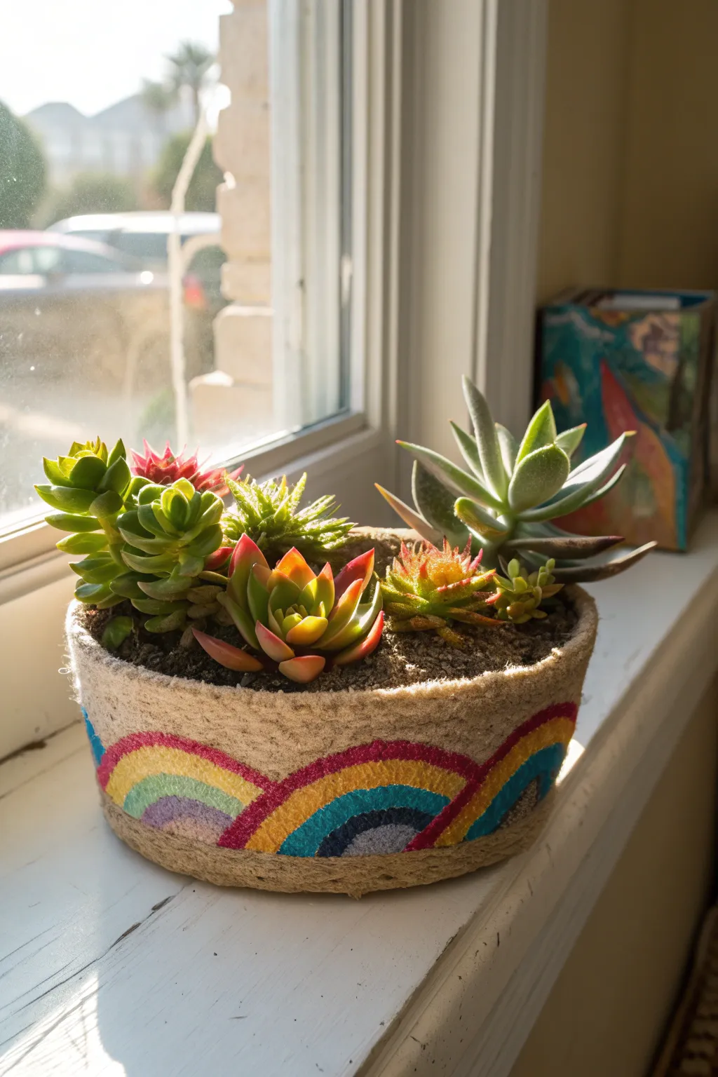 For a pop of color, paint a simple basket in bold hues and fill it with contrasting succulents like Sedum and Aloe. This playful approach can brighten up any spot.