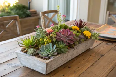 Fill a wooden box with a mix of succulents and small ferns for a rustic centerpiece. It adds a natural, earthy feel to any tabletop.