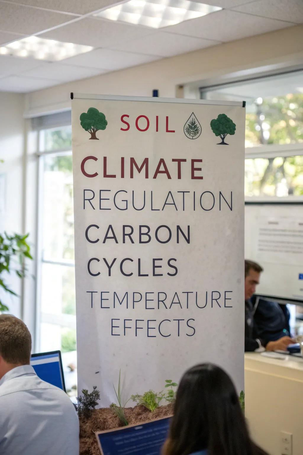 Create a poster that explains how soil helps regulate climate. Illustrate processes like carbon sequestration and temperature moderation.