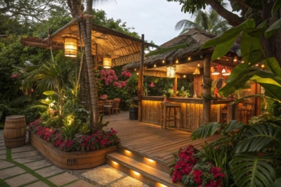 Nothing says ‘tropical escape’ quite like a tiki bar complete with bamboo accents and thatched roofing. I once helped a friend set up a cozy tiki bar, and it quickly became the heart of her garden parties.