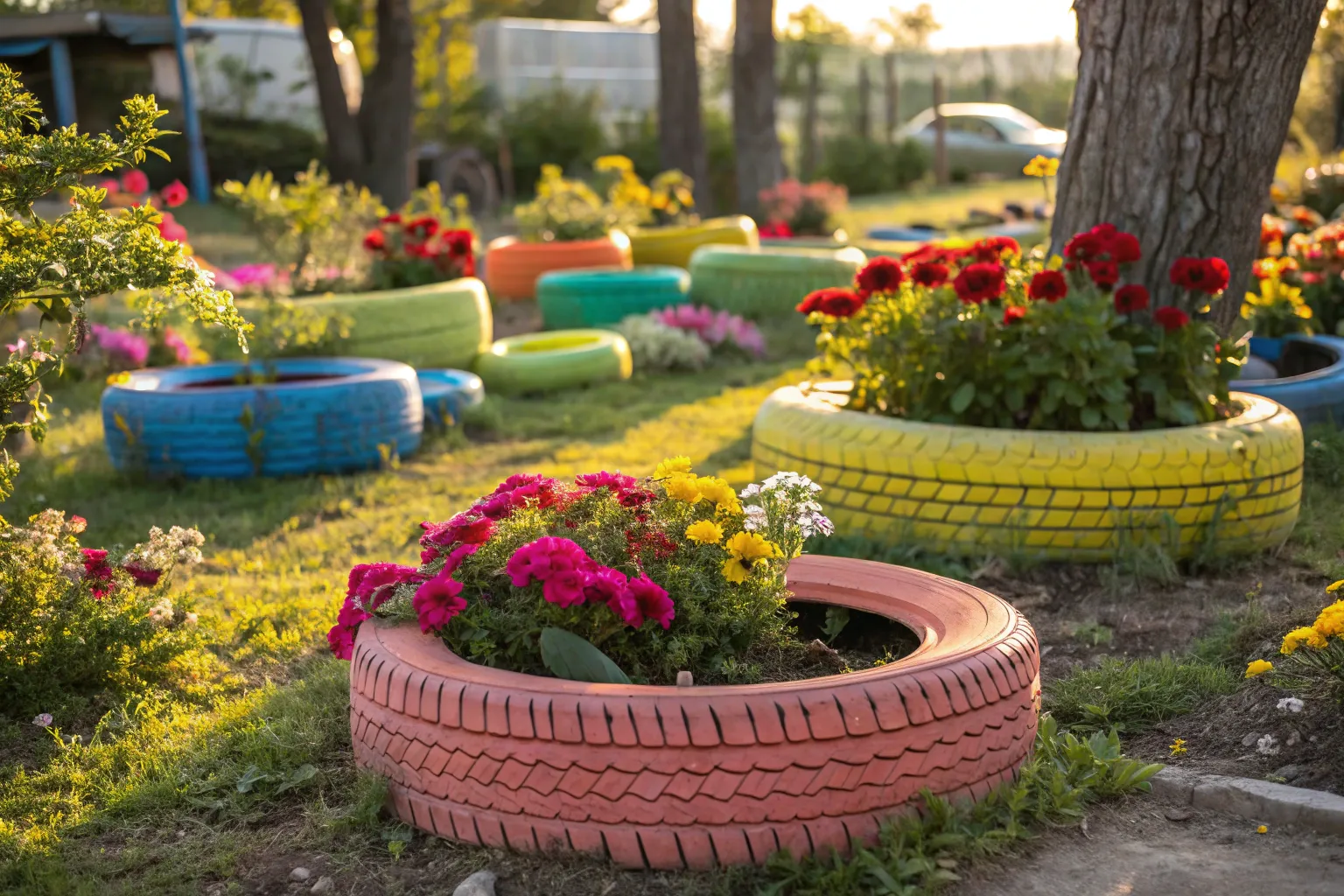 Create hanging planters with tires for a vertical garden effect. These are perfect for adding greenery to walls or fences and create a lovely cascade of plants.
