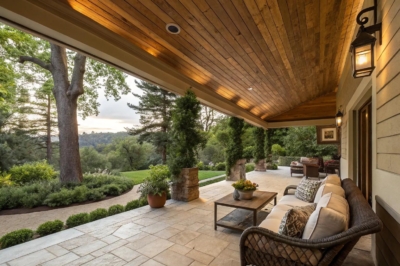 A covered patio with a tongue and groove ceiling offers the perfect spot for relaxation and entertaining. I’ve helped many clients create outdoor havens they can enjoy year-round.