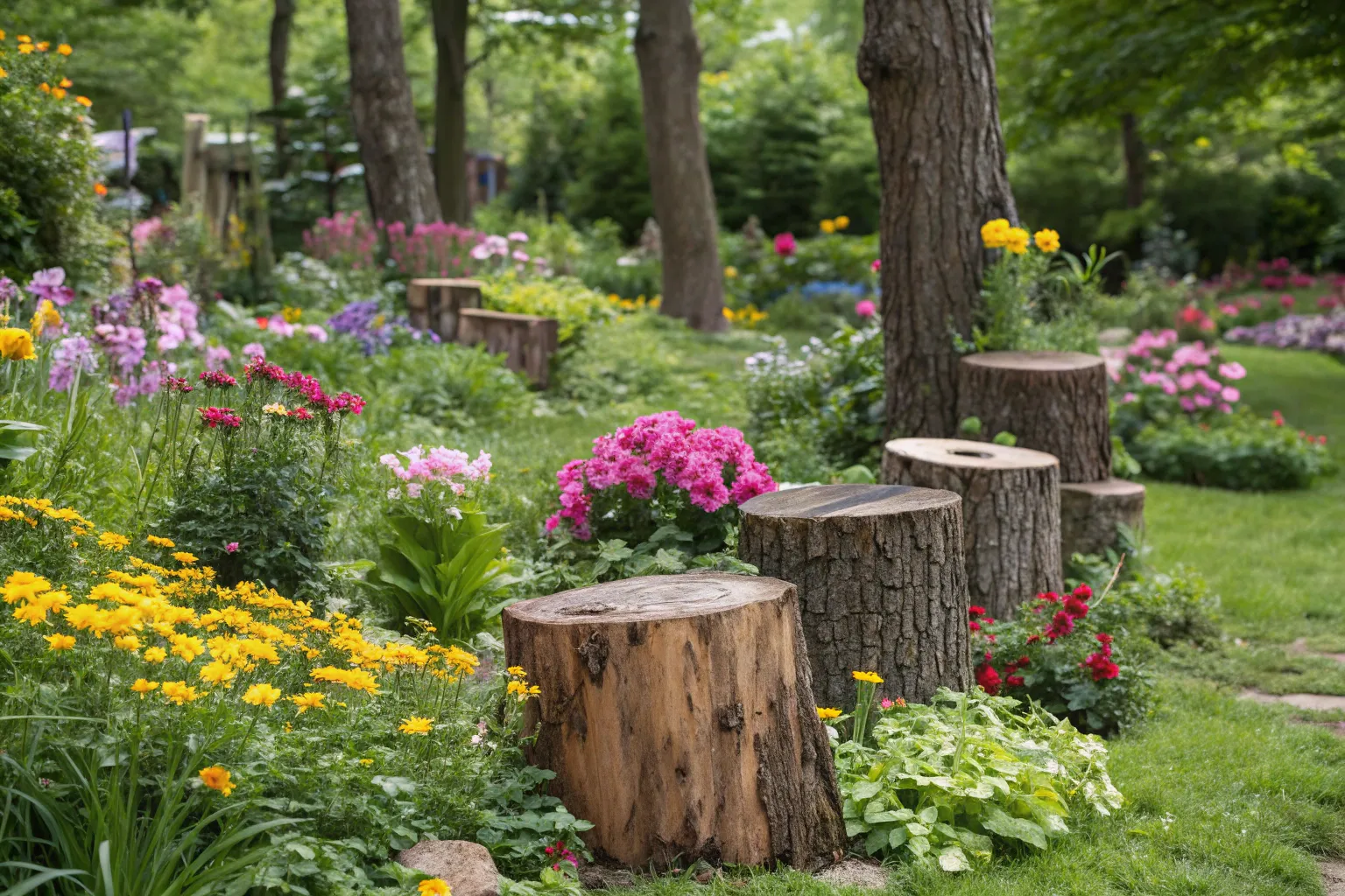 Use several stumps as picnic seating around a low table for an outdoor dining area. It’s a rustic and inviting space for family and friends to gather. I’ve helped design these spots for clients who love hosting garden get-togethers.