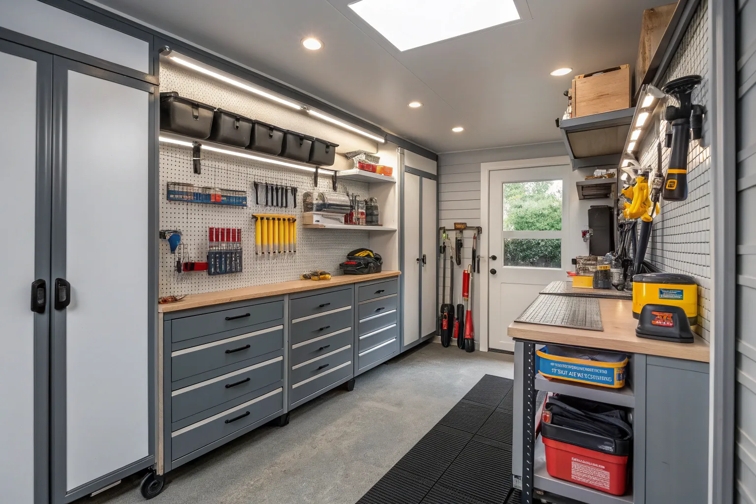 A built-in workbench can double as storage and a workspace, perfect for those weekend DIY projects. Many clients love having a dedicated area to get creative.