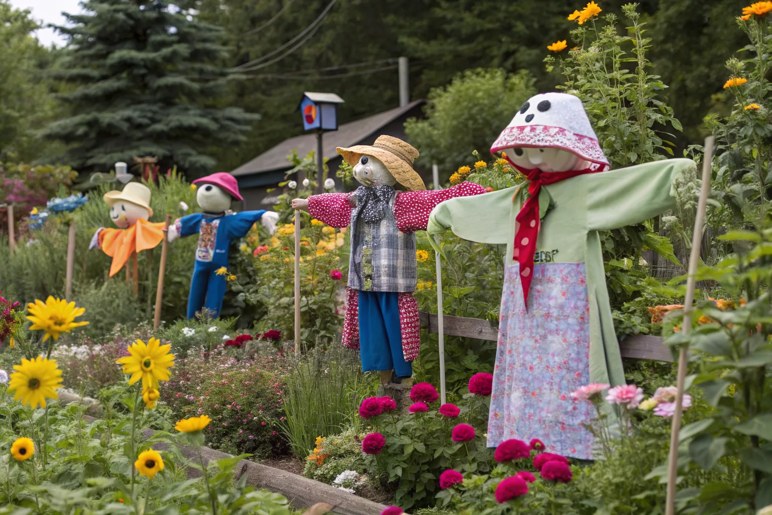 Blend scarecrows with the natural garden setting by using plant-like materials and earthy tones. This eco-friendly approach is a favorite among my clients who love subtlety.