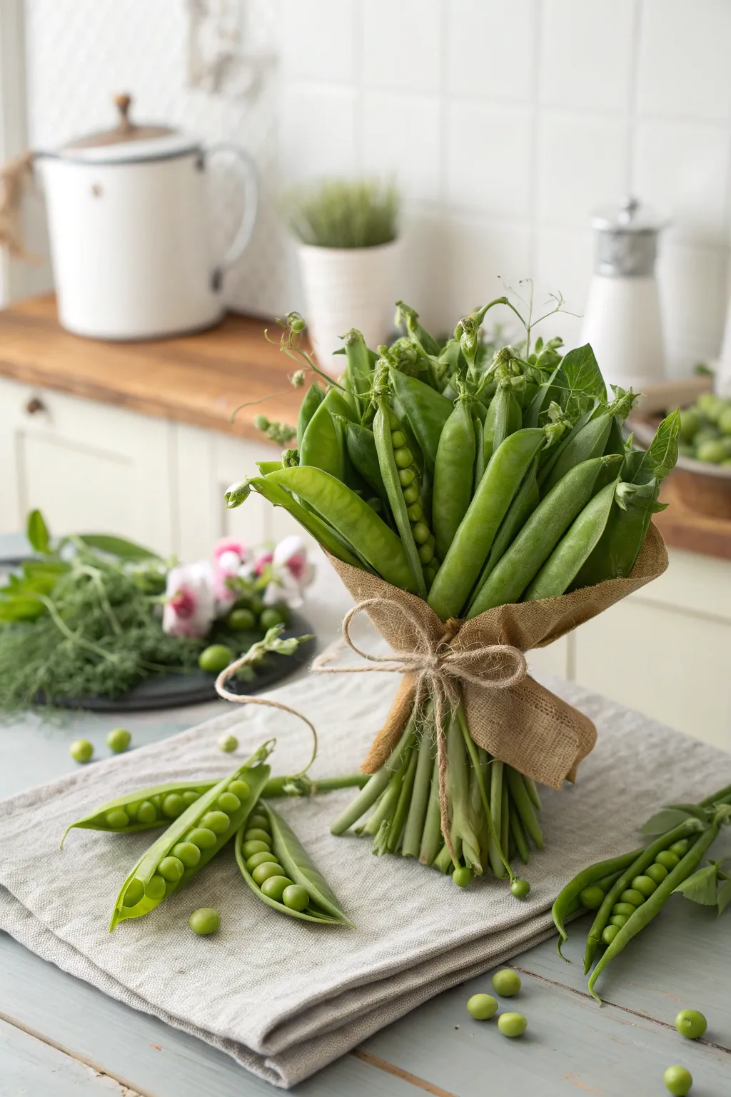 Snap peas or snow peas add a crisp, vibrant green to any bouquet. They’re a fresh favorite in my garden studio, perfect for a crunchy touch.