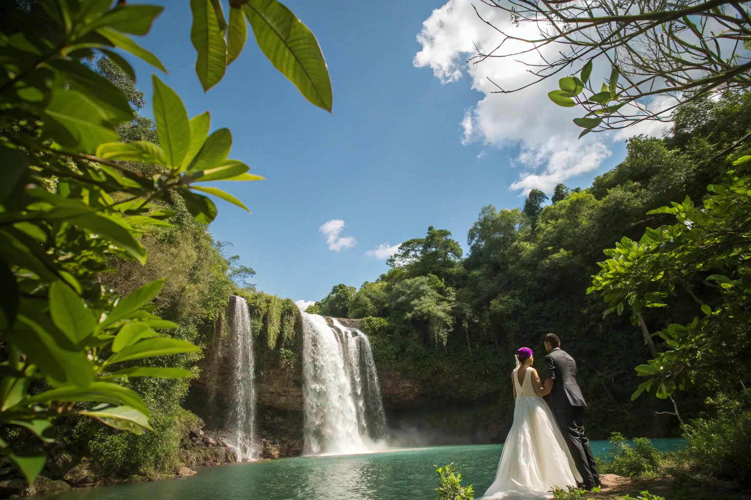 Consider exchanging your vows at sunset for a truly breathtaking experience. The golden light over the waterfall creates an unforgettable moment.