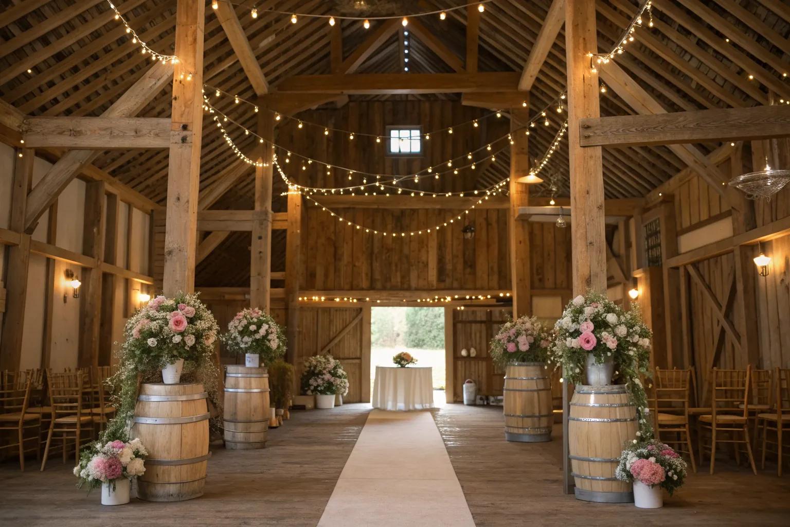 - String Lights: Transform your barn with warm string lights, adding elegance without overwhelming the natural setting.