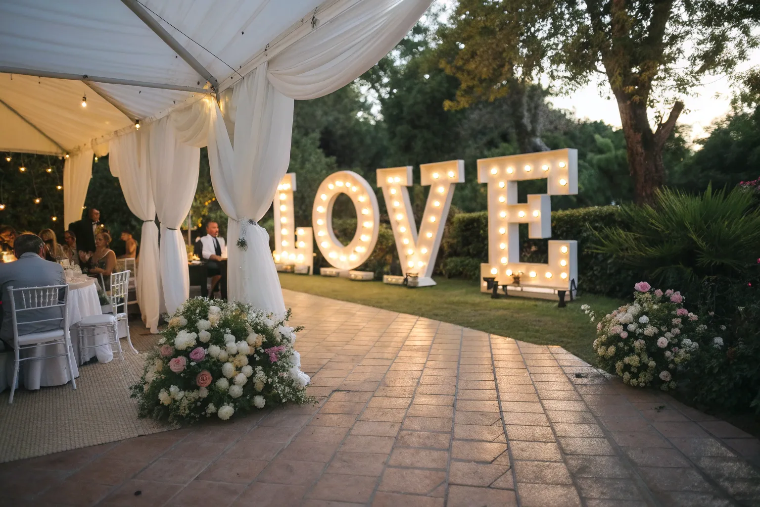 A large, glowing ‘LOVE’ sign is perfect for setting a romantic tone. In my garden studio, such signs have often been the centerpiece of memorable wedding photos.