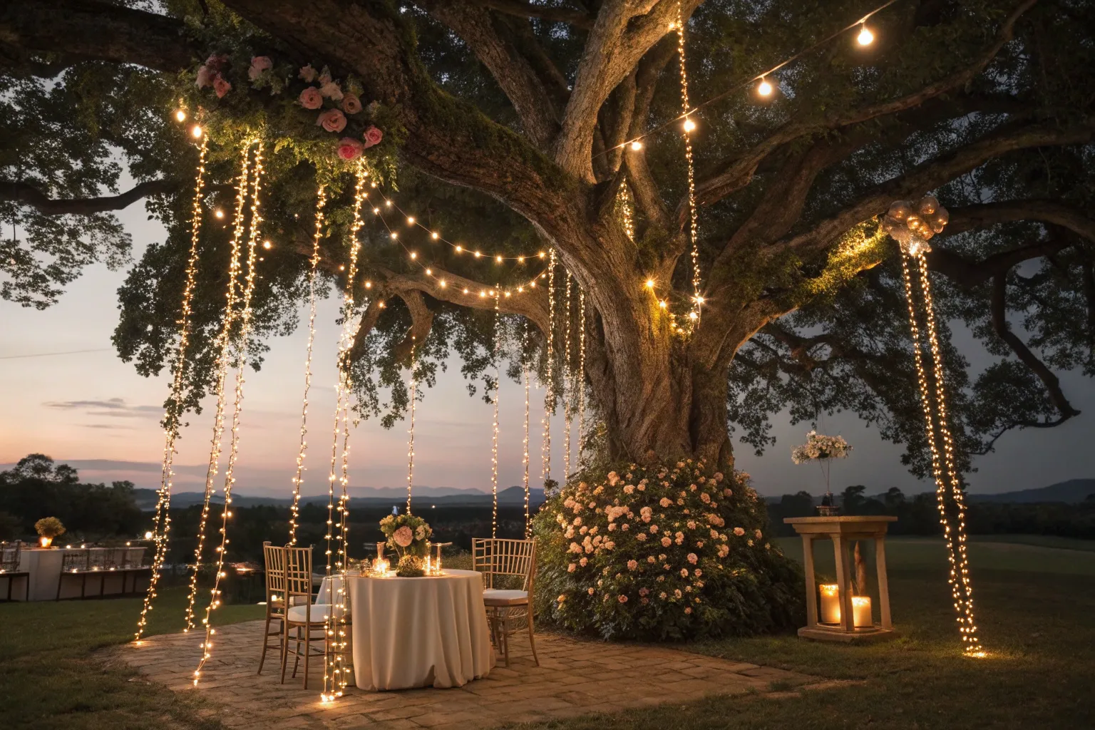 Draping fairy lights around tree trunks can transform your venue into a twinkling wonderland.