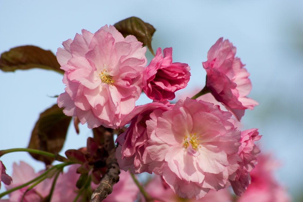 Double flowering types, such as Kwanzan, have many more petals on the flowers than average, the average being five petals per flower. Kwanzan, also known as Kanzan, trees have an astonishing 28 bright pink petals per flower, making these blooms especially robust.