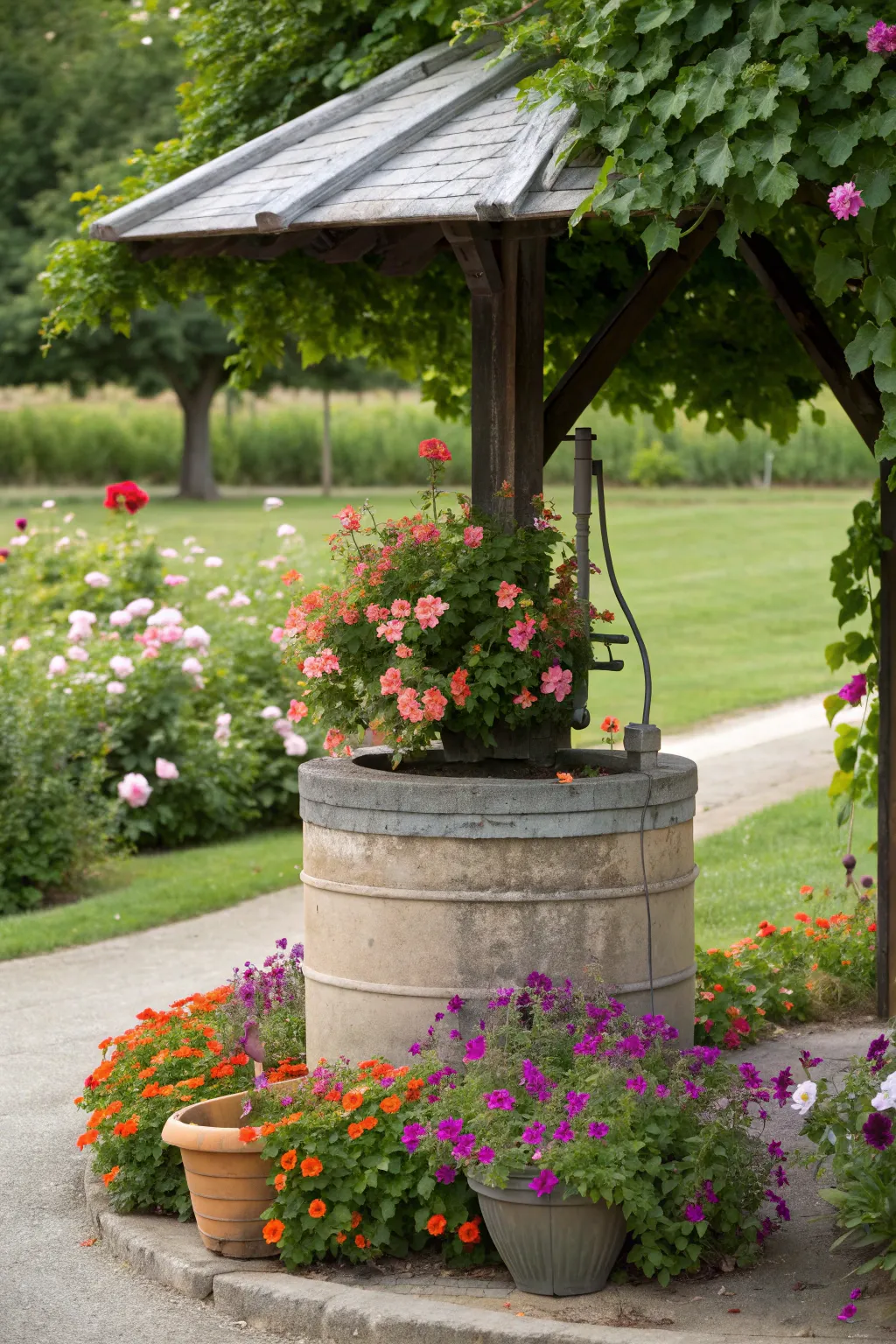 Use a trellis to guide climbing vines around the well pipe, turning it into a vertical garden feature. This is especially beautiful with flowering vines.