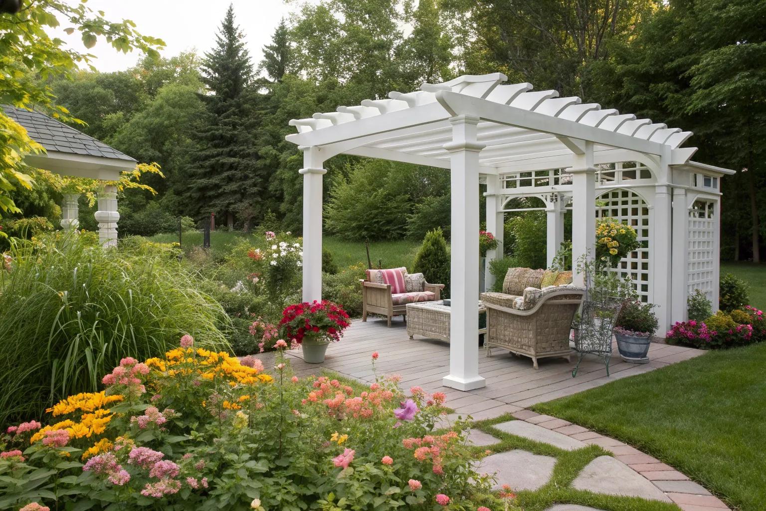 Position your white pergola to take advantage of stunning garden views. I helped a client place their pergola to overlook their blooming flower garden, enhancing their outdoor experience.